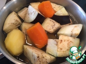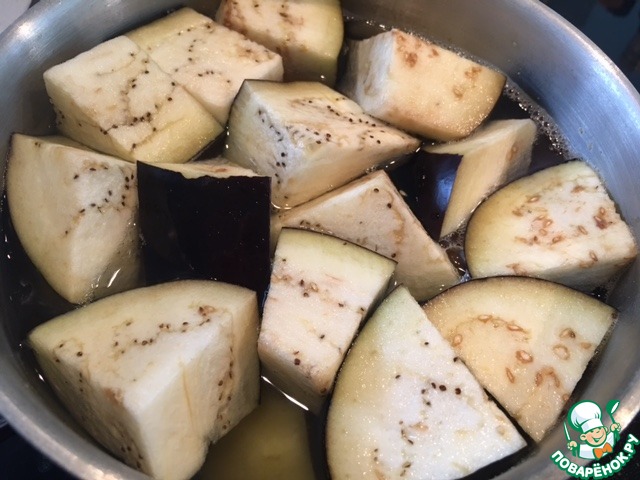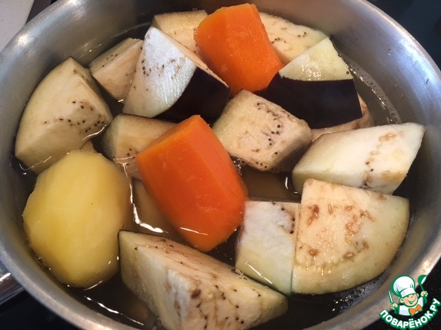 За 5 мин до готовности добавьте баклажан, нарезанный на крупные кусочки. Варите до готовности. Остудите.