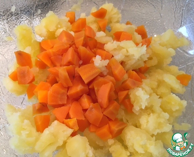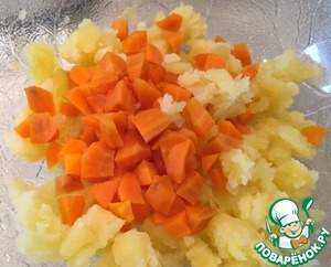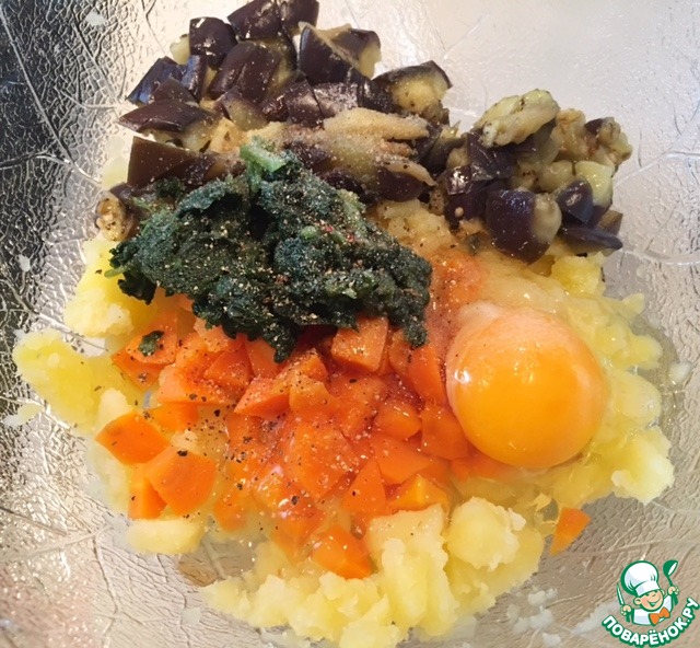 Вилкой разомните картофель, нарежьте мелким кубиком морковь, баклажан.
