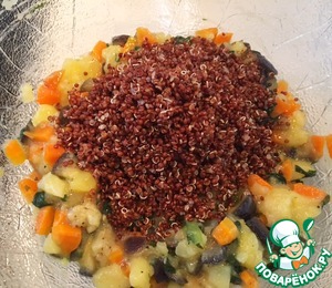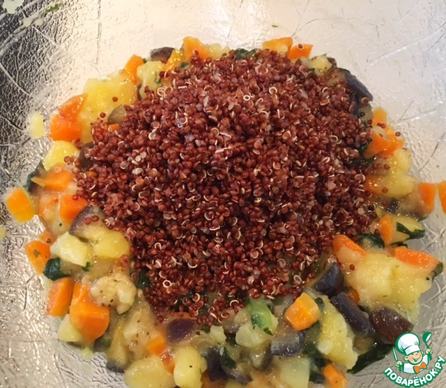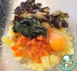 Отожмите лишнюю воду и нарежьте мелко. Добавьте к овощам. Вбейте 2 белка и 1 желток. Посолите и поперчите.