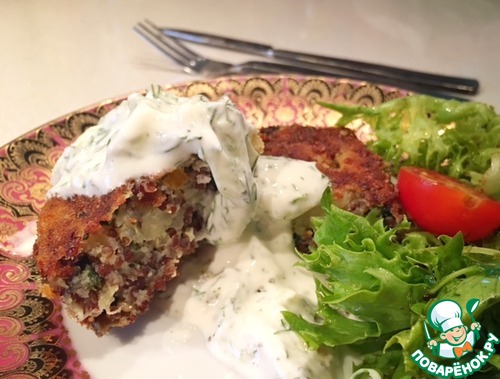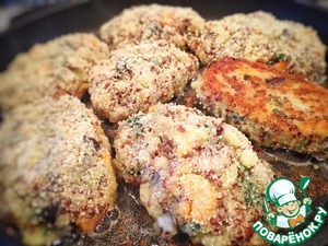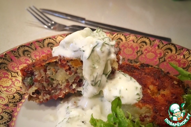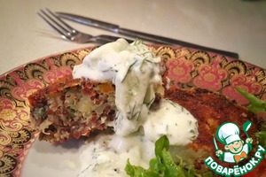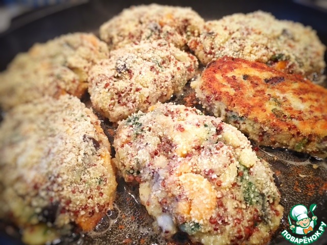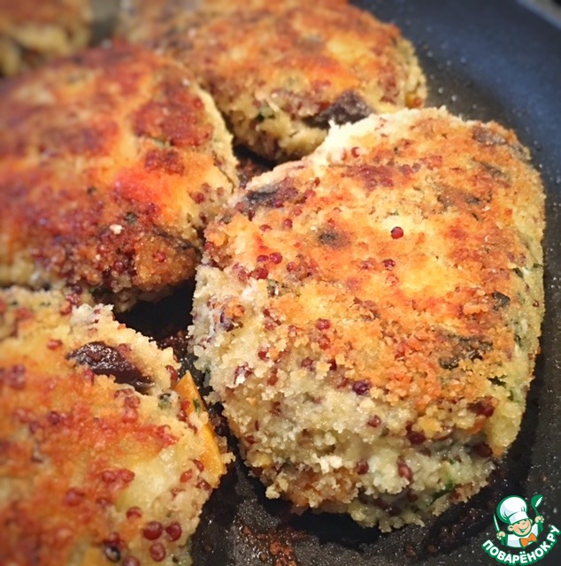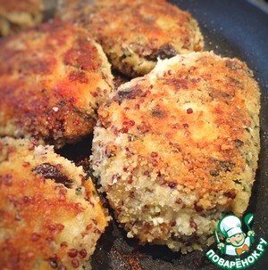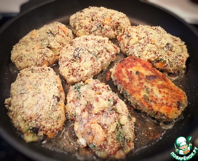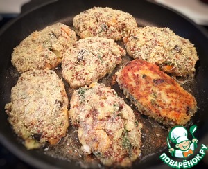 Перемешайте все ингредиенты. Попробуйте на соль и перец. Приготовьте панированные сухари. Сформируйте стейки большого размера (у меня с ладонь), обваляйте в сухарях и выкладывайте на сковороду.