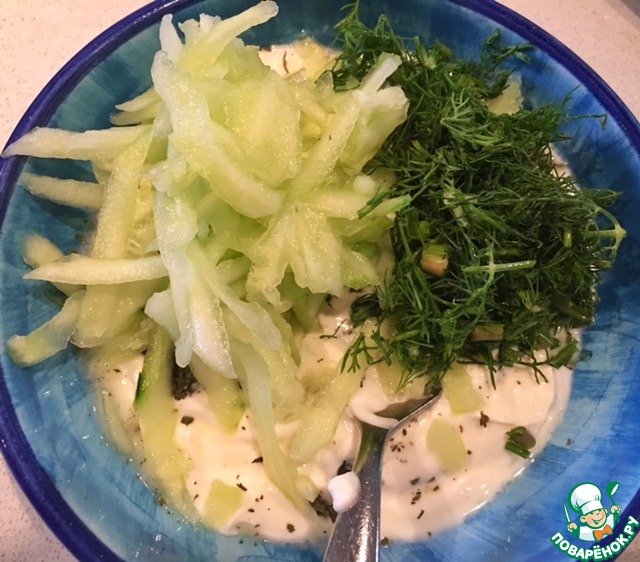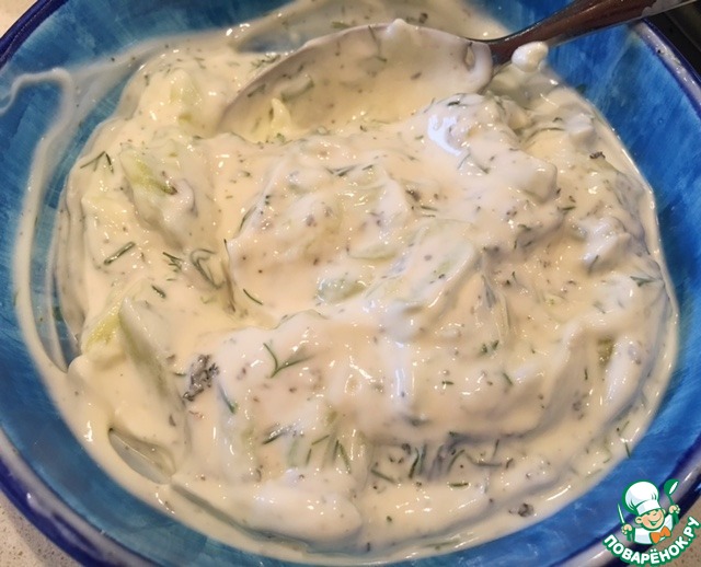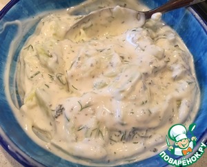 Натрите и отожмите огурец. Добавьте к Йогурту. Посолите и перемешайте. Соус готов. Освежающий, нежный, дополняющий вкус овощей.