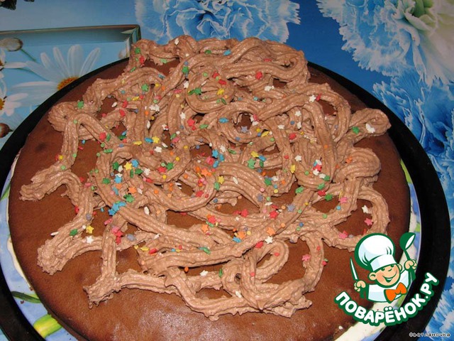 Незадолго до подачи взбить сливки в крепкую пену и украсить торт. Мне уже украшать было некогда (все стояли над душой и ныли в предвкушении), поэтому я пошла по ленивому варианту: украсила готовыми взбитыми сливками из баллончика и фабричной посыпкой).