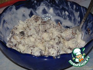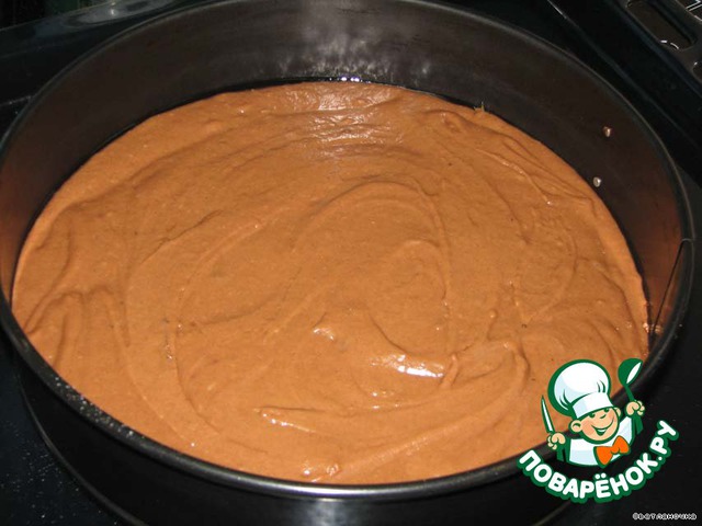 Приготовленную массу выложить в смазанную жиром форму (24 см) и выпекать в нагретом духовом шкафу при температуре 180°С 35-40 минут.
