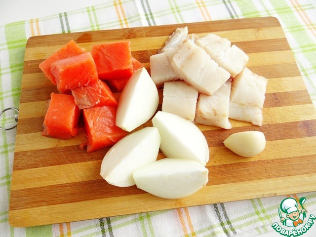 Подготавливаю продукты для начинки - нарезаю небольшими кусочками филе форели и трески, очищенный репчатый лук нарезаю на четыре части.