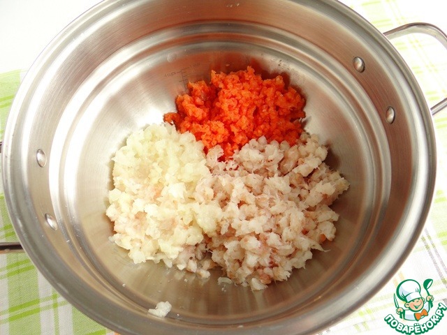 Пропускаю через мясорубку рыбу, репчатый лук, чеснок.