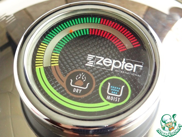 Закрываю крышкой сотейник, ставлю его на плиту, включаю на самый маленький огонь (у моей электроплиты на переключателе 4 деления, поэтому я включаю на единицу). Даю стрелке термоконтроллера дойти до середины зеленого поля, затем отключаю плиту. Оставляю сотейник на плите еще на 15 минут.