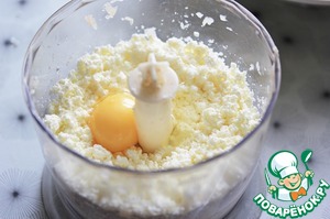 Выложить фарш в миску, добавить к нему творог с яйцом.