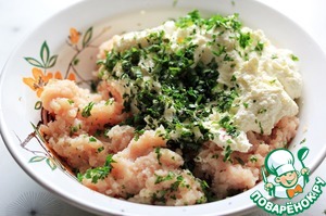 Зелень вымыть, обсушить, оборвать листочки, измельчить тяжелым ножом и добавить к фаршу. Можно добавить к фаршу специи.