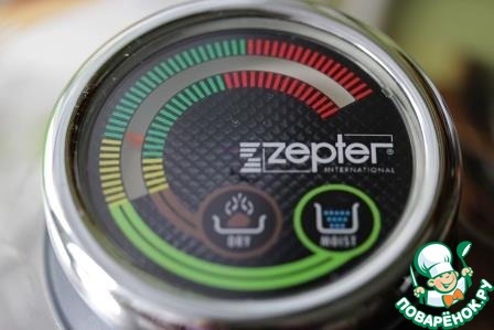 Когда стрелка термоконтроллера достигнет зеленого поля, переключить нагрев на минимальный и готовить 15 минут. По истечении времени снять посуду Zepter с плиты.