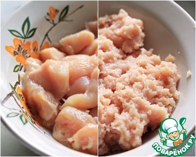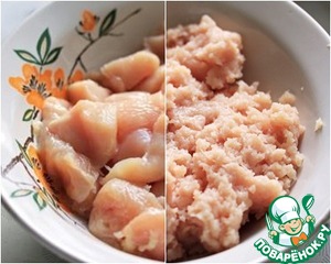 Куриное филе вымыть, обсушить, удалить пленки и жир, если они есть. Нарезать филе на небольшие кусочки, затем измельчить его при помощи блендера или мясорубки.
