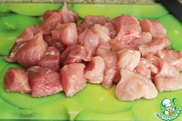 Мясо вымыть, обсушить, зачистить от жира и нарезать небольшими кусочками.