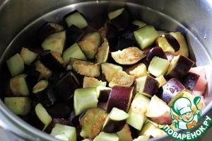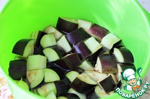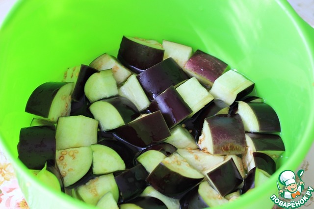 Сложить нарезанные баклажаны в миску, залить соленой водой и оставить на 15 минут.