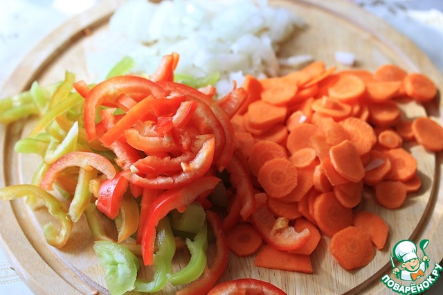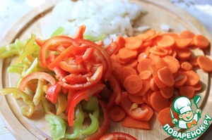 Лук мелко нарезать, морковь нарезать кружочками, перец - соломкой.