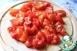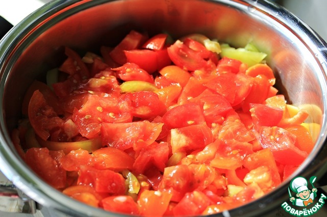 Выложить помидоры верхним слоем. Закрыть кастрюлю крышкой, поставить на плиту на средний нагрев. Когда стрелка термоконтролера достигнет зеленого поля, убавить огонь до минимума и готовить 30 минут.