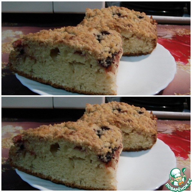 Сверху пирог посыпать сладкой крошкой, которая дожидалась своей очереди в холодильнике.