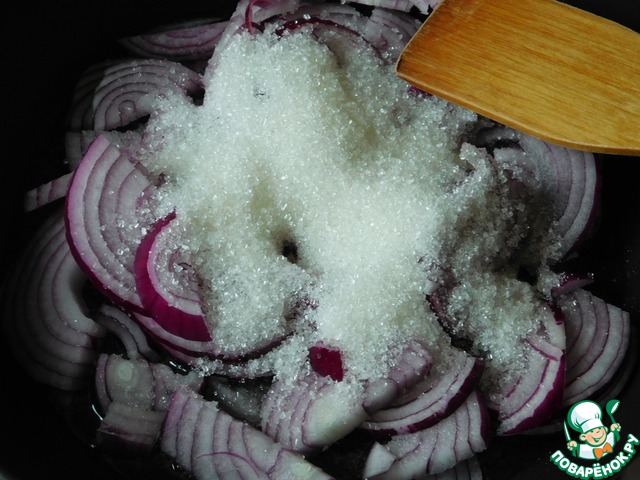 В сковороде разогреваем оливковое масло, выкладываем лук и сахар и на среднем огне готовим лук около 15-ти минут, без крышки помешивая.