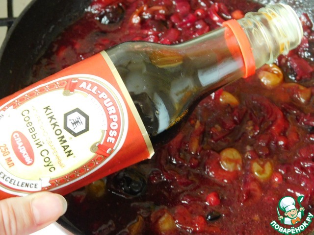 Добавляем сладкий соевый соус ТМ Kikkoman, продолжаем уваривать конфитюр ещё 10-15-ть минут или до нужной консистенции.