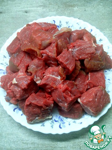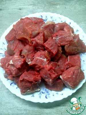 Говядину промыть, обмакнуть воду, нарезать средними кусочками поперек волокон.
