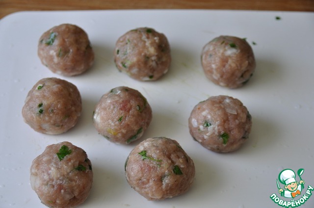 Добавляем измельчённую зелень, у меня петрушка, крахмал, хорошо вымешиваем фарш и делаем шарики размером с грецкий орех.