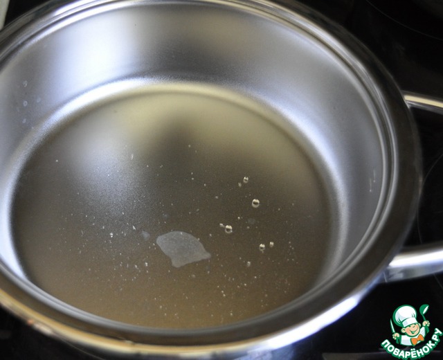 На среднем огне (3 из 6) нагреваем сотейник Zepter. Готовность проверяем, брызнув водой на поверхность разогретого сотейника, если вода раскатывается шариками -"жемчужинами", то сотейник готов для жарки.