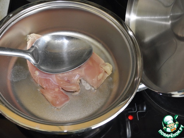 На дно сотейника кладём куриную грудку, прижимаем, чтобы была максимальная площадь соприкосновения грудки и дна. Готовим без масла, в этом всё преимущество посуды Zepter.