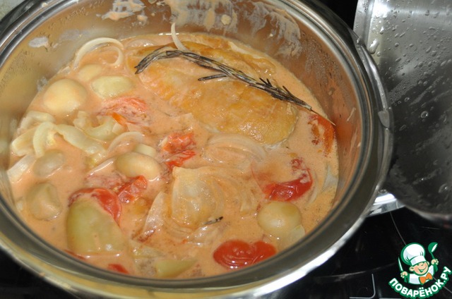 Открываем крышку сотейника и удобно закрепляем её за ручку. Заливаем курицу и овощи соусом. Закрываем крышку, отключаем огонь, убираем сотейник с плиты. И оставляем "доходить" около 20 минут.