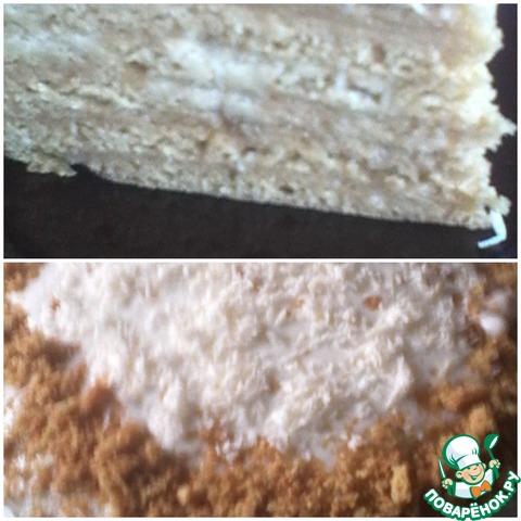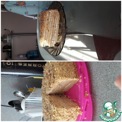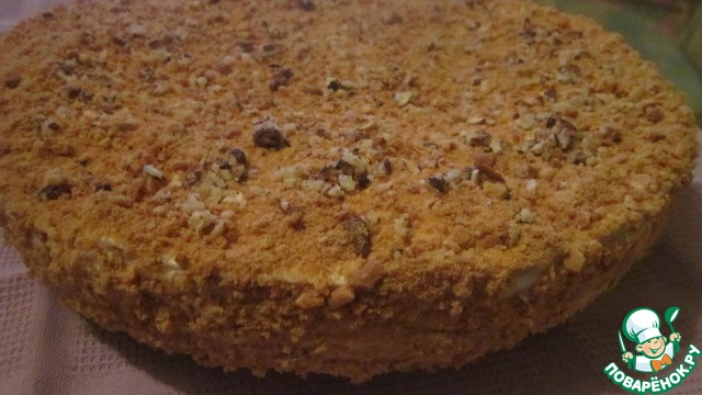 10. Обрезки или оставшиеся коржи сложите в пакет и раздробите с помощью скалки в крошку. Вместо крошки вы можете измельчить орехи. Полученной крошкой обсыпьте верх и края медовика