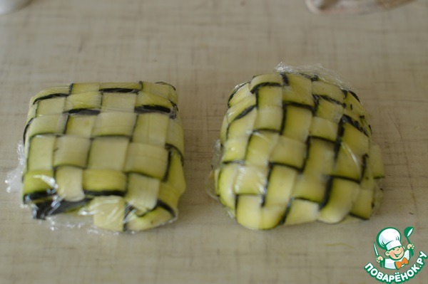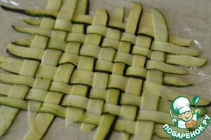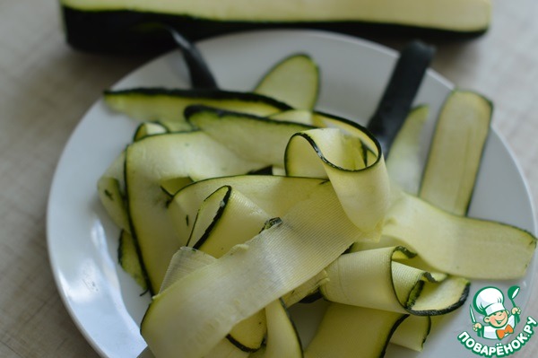 Цуккини нарезать тонкими полосками. Каждую полоску разрезать вдоль на 2 половинки.