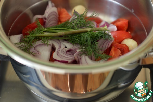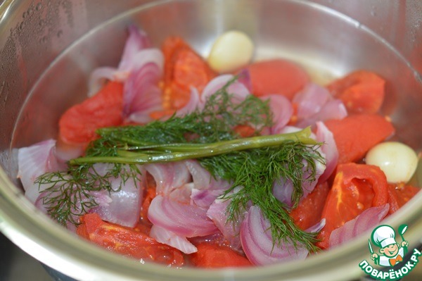 С помидоров снять кожицу, разрезать на 4 части. Лук нарезать произвольно. В холодную кастрюлю сложить помидоры, лук, чеснок и укроп. -