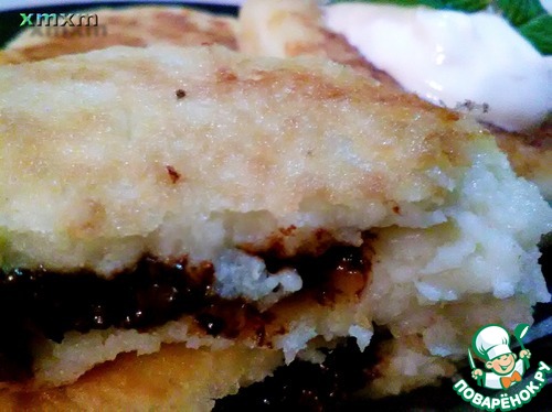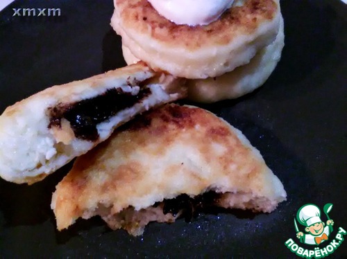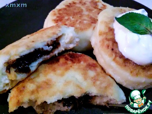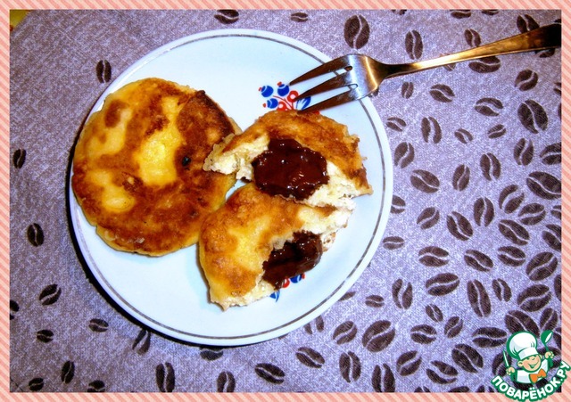 Складываем края каждого сырника к середине, тем самым накрываем шоколад. Отправляем сырники на горячую сковороду с маслом. Жарим их на медленном огне. Первую сторону обжариваем без крышки. Вторую сторону обжариваем накрыв сковороду крышкой. В итоге получаем вот такие вот сырники.