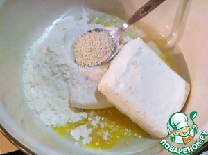 В глубокую посуду выкладываем творог, муку, яйца, соль, сахар и кунжут.