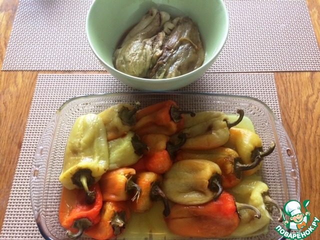 Выпекаем перцы (у меня 15 шт) и баклажаны (2 крупных) в духовке до готовности. Остужаем и очищаем.