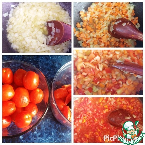 Моем и чистим лук, морковь (у меня крупные), томаты (у меня средние) и 4 болгарских перца. Нарезаем кубиками лук, морковь и перец. В казанок наливаем растительное масло и отправляем лук. Обжариваем его до мягкости. Затем добавляем морковь и продолжаем обжаривать, пока морковь не обмякнет. Отправляем нарезанный свежий болгарский перец и еще немного обжариваем, постоянно помешивая овощную смесь. Томаты нарезаем дольками и пробиваем их в блендере. Добавляем полученный томатный сок к овощам. Доводим до кипения, уменьшаем огонь и немного увариваем/выпариваем жидкость, минут 15 — 20 (зависит от помидоров, насколько они были мясистыми).