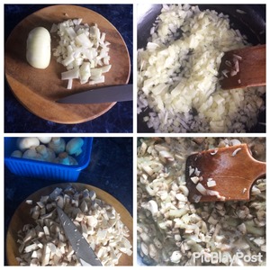 Подготовим грибную начинку. Чищенный лук нарезаем кубиком. Моем тщательно грибы и также режем кубиком. Тушим лук и грибы на растительном масле до готовности, минут 15-20. Солим, перчим по вкусу.