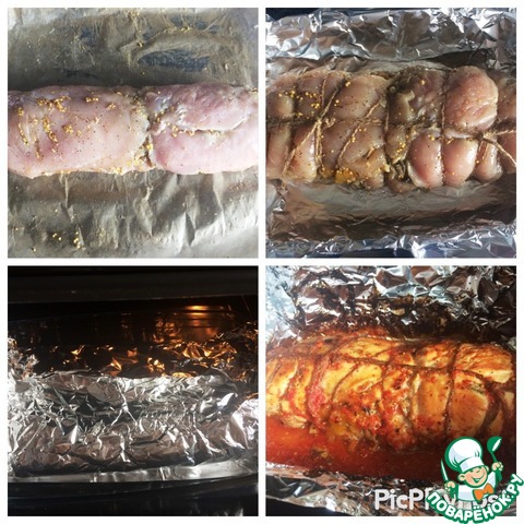 Перевязываем ниткой. Укладываем рулет в форму для запекания, и сверху распределяем томатно-медовый соус.