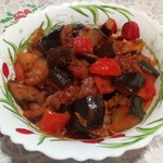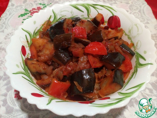 В баклажаны с перцем наливаем холодную воду перемешиваем отжимаем и добавляем к жарящимся помидорам. В процессе приготовления 2 -3 раза перемешиваем и добавляем по вкусу перец.