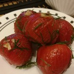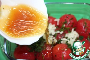 Затем убрать в холодильник минимум на сутки. Раза три слегка встряхнуть тару, чтобы помидоры покувыркались в маринаде.