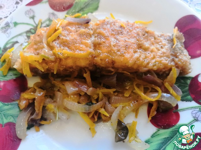 Кусочки рыбы посолить, поперчить по вкусу. Запанировать в панировочных сухарях.