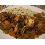 Добавить лемонграс, пряную сушеную зелень, лавровый лист, соль, душистый перец горошком. Тушить до полуготовности (средней степени мягкости) и выпаривания жидкости, затем добавить уксус (2 ст. ложки), растительное масло и пассеровать до легкой золотистой корочки.