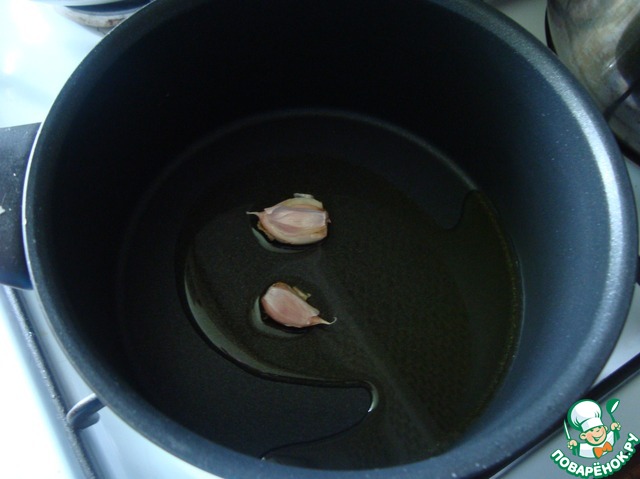 В сотейнике с толстым дном разогреваем оливковое масло и выкладываем чеснок прямо в шкурке, предварительно раздавив его плоской стороной ножа. Делаем с минуту и убираем его. Нужно просто, чтобы масло стало ароматное от чеснока.
