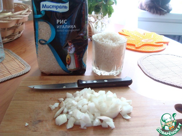 Готовим на сотейник 1 стакан риса ИТАЛИКА ТМ МИСТРАЛЬ. Очень хорош рис для ризотто. Можно взять обычный, круглый рис.