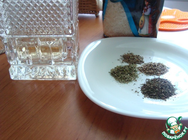 Добавляем в рис белое, сухое вино. Готовим специи. Я взяла по чайной ложке: орегано, мята, базилик, розмарин. Можно взять просто смесь- итальянские травы, она свободно продаётся в магазинах.