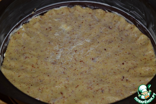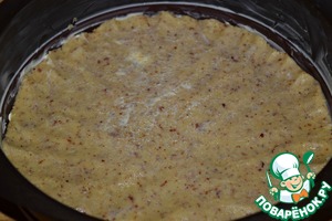 Тесто разделить на две равные части. Положить одну в форму, хорошо смазанную сливочным маслом (диаметр 20 см) и равномерно распределить по дну формы ложкой или лопаткой.