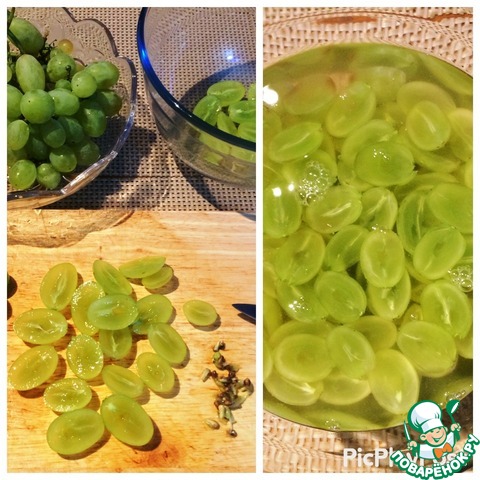 Помыть, отделить ягоды, нарезать пополам и очистить от косточек. Замочить ягоды в вине на ночь. -