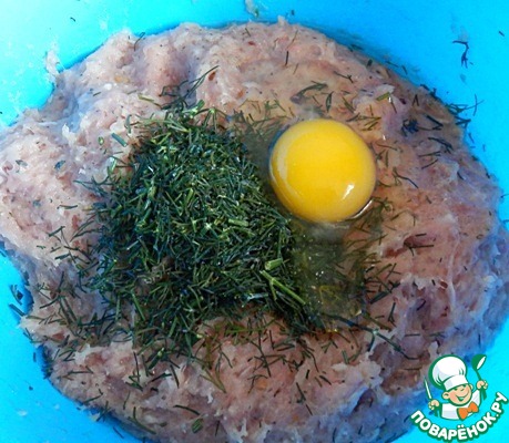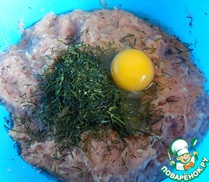 Смешать в миске два вида фарша, чеснок (виыдавить через чеснокодавку), зелень (мелко порезать), яйцо, соль и перец. Тщательно вымешать.
