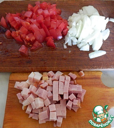 Ветчину и помидоры нарезать небольшими кусочками. Лук очистить и измельчить.