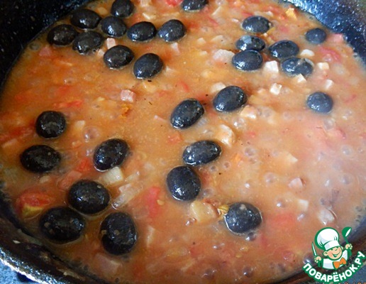 Соединяем вместе ветчину, помидоры, лук, теплый бульон и 1 ст. л муки. Хорошо перемешиваем, чтобы мука не оставила комочков.