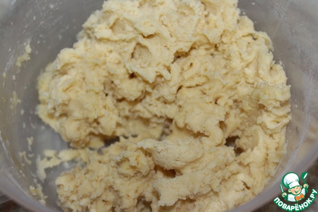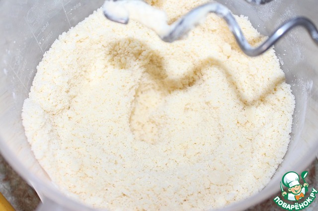 Охлажденное масло нарезать кубиками, добавить в миску с мукой, солью и сахаром. Порубить так, чтоб масса напоминала крошки. Я это делала с помощью миксера со специальными насадками. -