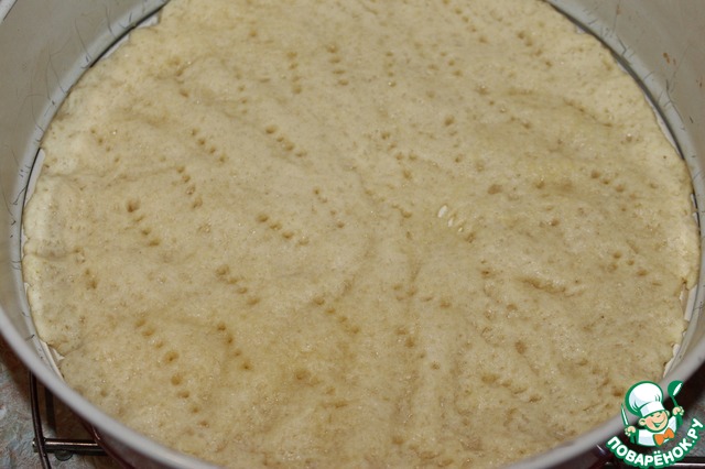 Форму 24 см смазать сливочным маслом. Я использовала 1/2 часть от теста, остальное положила в морозилку для следующего раза. Распределить тесто по дну формы, сделать проколы вилкой по всему периметру и поставить выпекать в разогретую духовку до 200 градусов.