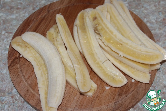 Пока займемся бананами. Очистим их от кожуры и разрежим их вдоль на полоски.
